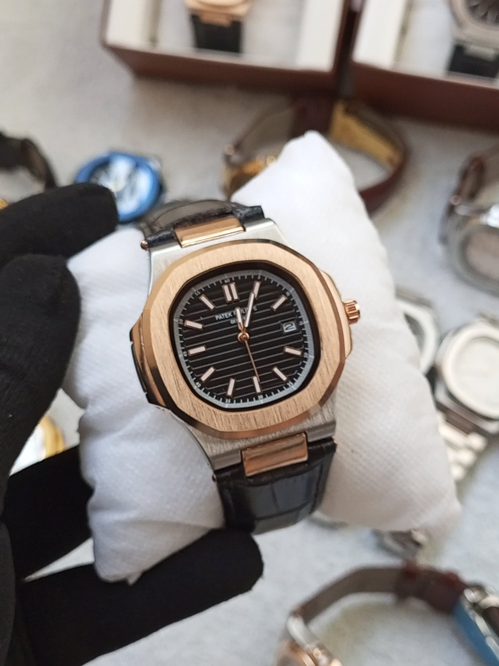 The P.p Nautilus men's straps watch offers a timeless look with its date just feature, leather strap, and 40 mm dail size. Its master lock ensures durability and security. Perfect for any occasion as it combines style and functionality.